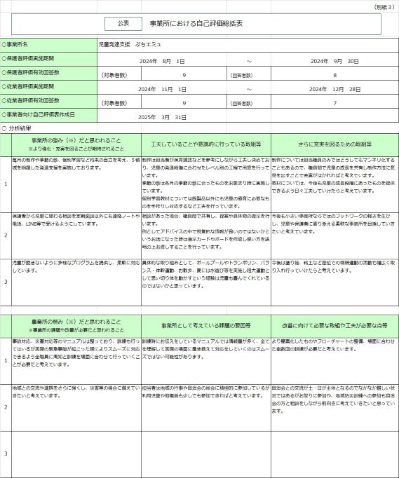 事業所従業員を対象にアンケートを集計いたしました。 2024年度の児童発達支援、放課後等デイサービスの事業所自己評価アンケートの結果はこのようになりました。 この結果をふまえ今後の支援をより充実させていきたいと思っております。 このページの最後に集計結果のリンクページを記載しております。