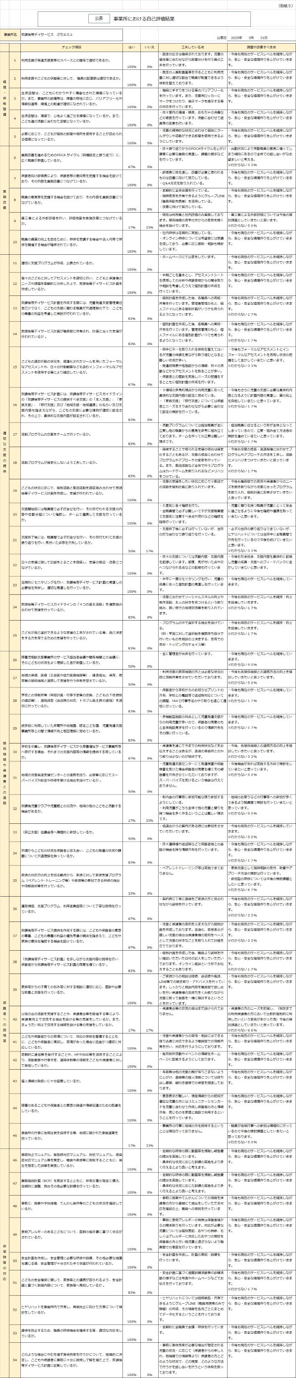 上記の設問表を皆様にお配りし、アンケートを集計いたしました。 2024年度の児童発達支援、放課後等デイサービスの事業所評価表の結果はこのようになりました。 ご協力ありがとうございました。皆様からのご意見を参考に今後の支援をより充実させていきたいと思っております。 このページの最後に集計結果のリンクページを記載しております。